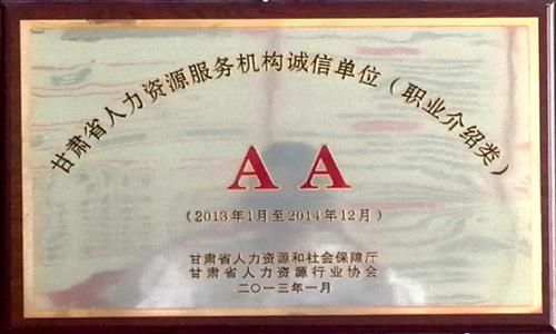 2013年2月公司職介所被甘肅省人力資源和社會(huì)保障局、甘肅省人力資源行業(yè)協(xié)會(huì)授予“AA級(jí)誠(chéng)信單位”;